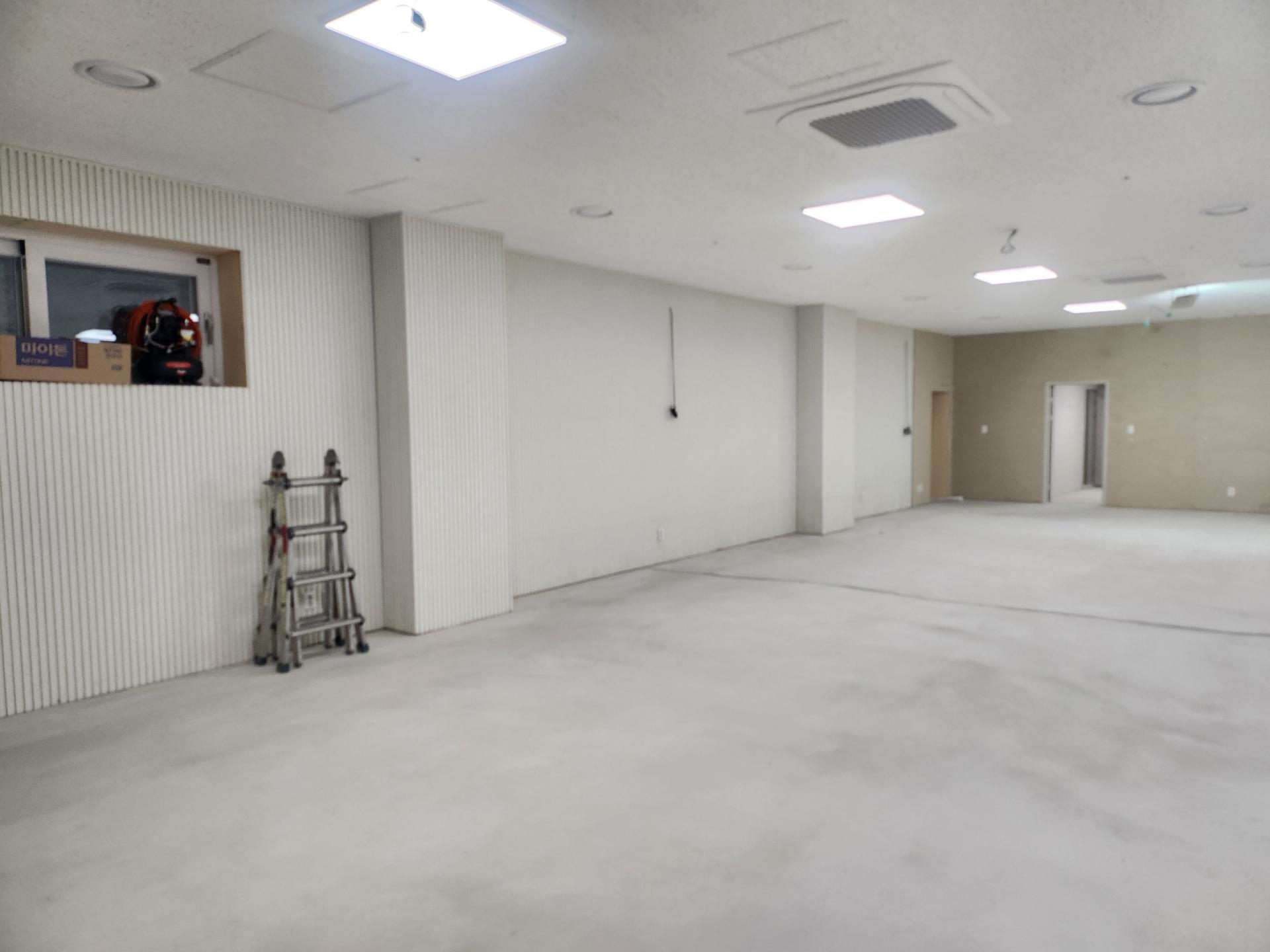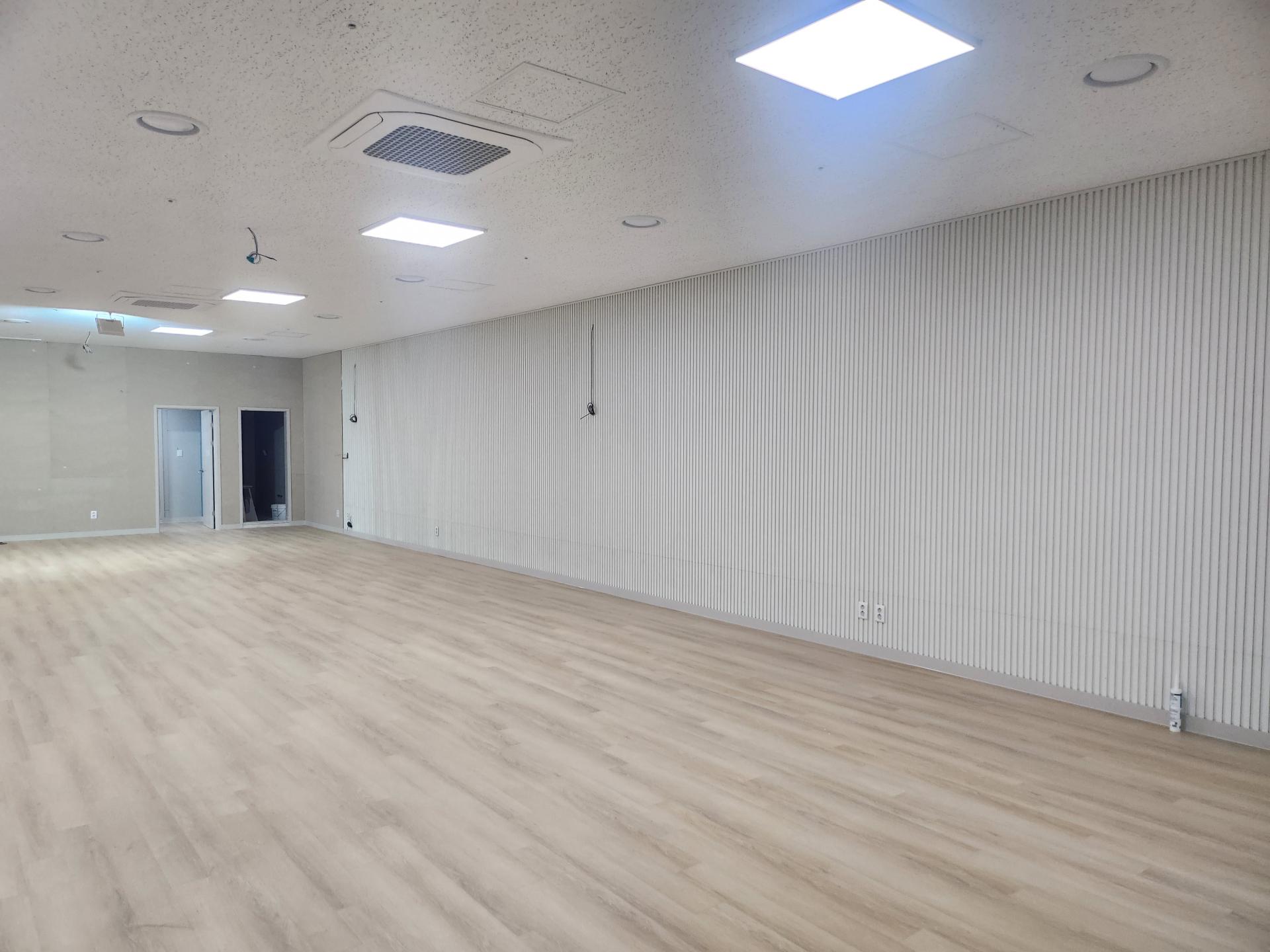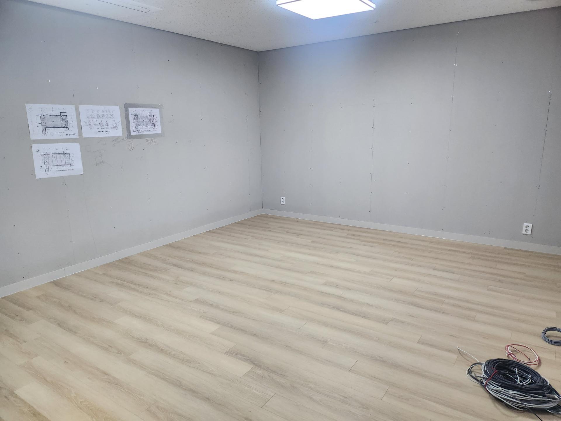 최근 인테리어 공사가 순조롭게 진행되고 있습니다. 각 실에 흡음재와 템바루바 설치를 마쳤으며, 각 실 출입문, 정문 자동문, 중문, 탕비실 문틀 설치도 완료되었습니다. 에어컨 설치 작업이 마무리되었고, 바닥에는 강마루 시공을 완료하여 공간의 완성도를 높였습니다. 현재 도배 작업이 시작되어 진행 중입니다.